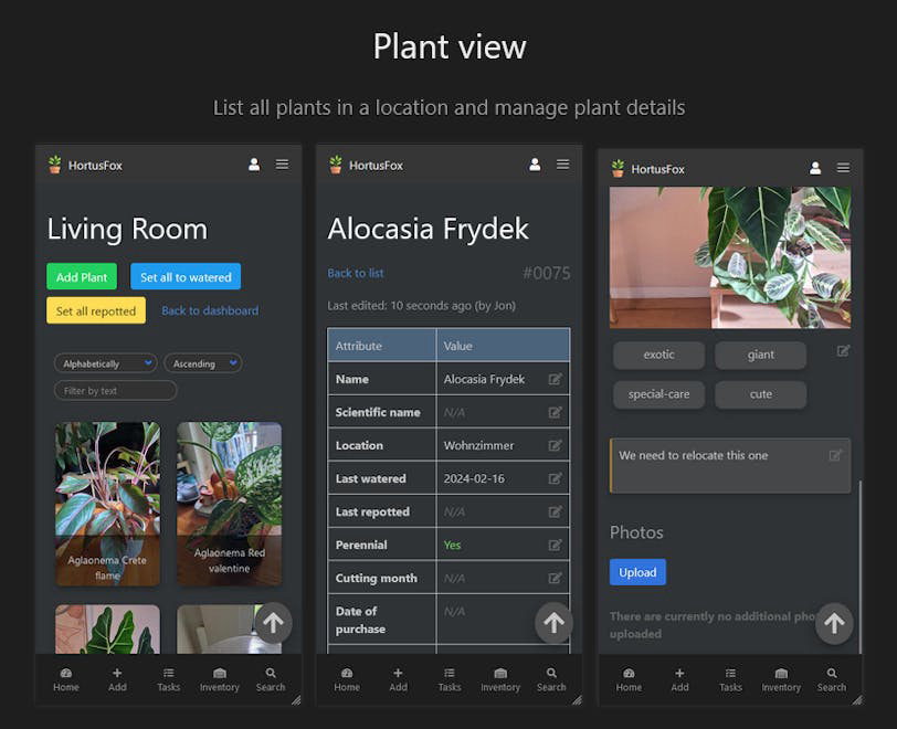 Track, categorize, and manage plants with detailed attributes, images, tags, and location assignments.